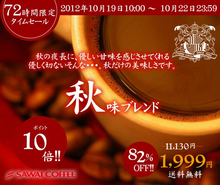 ショップオブザイヤー受賞店舗 カード利用可 ・お届け方法 常温発送 ・内容量 ●レギュラコーヒー秋味ブレンド 500g×4袋 ・焙煎具合 ミディアムロースト ・賞味期限 コーヒー豆は商品到着後一年間 ・保存方法 焼きたての香りを楽しんで頂きたいので、商品到着後はなるべく3ヶ月ぐらいで飲んで頂く事をお奨めいたします。また、長期の保存の場合は、当ショップの袋に入れたまま冷凍庫にて保管して頂きますと薫りが長持ちいたします。 ・商品特徴 澤井珈琲の創業10周年企画の期間限定、超大特価のお買い得福袋。焼きたてコーヒーをどっさり200杯分も詰めて、送料無料の1999円の大特... |